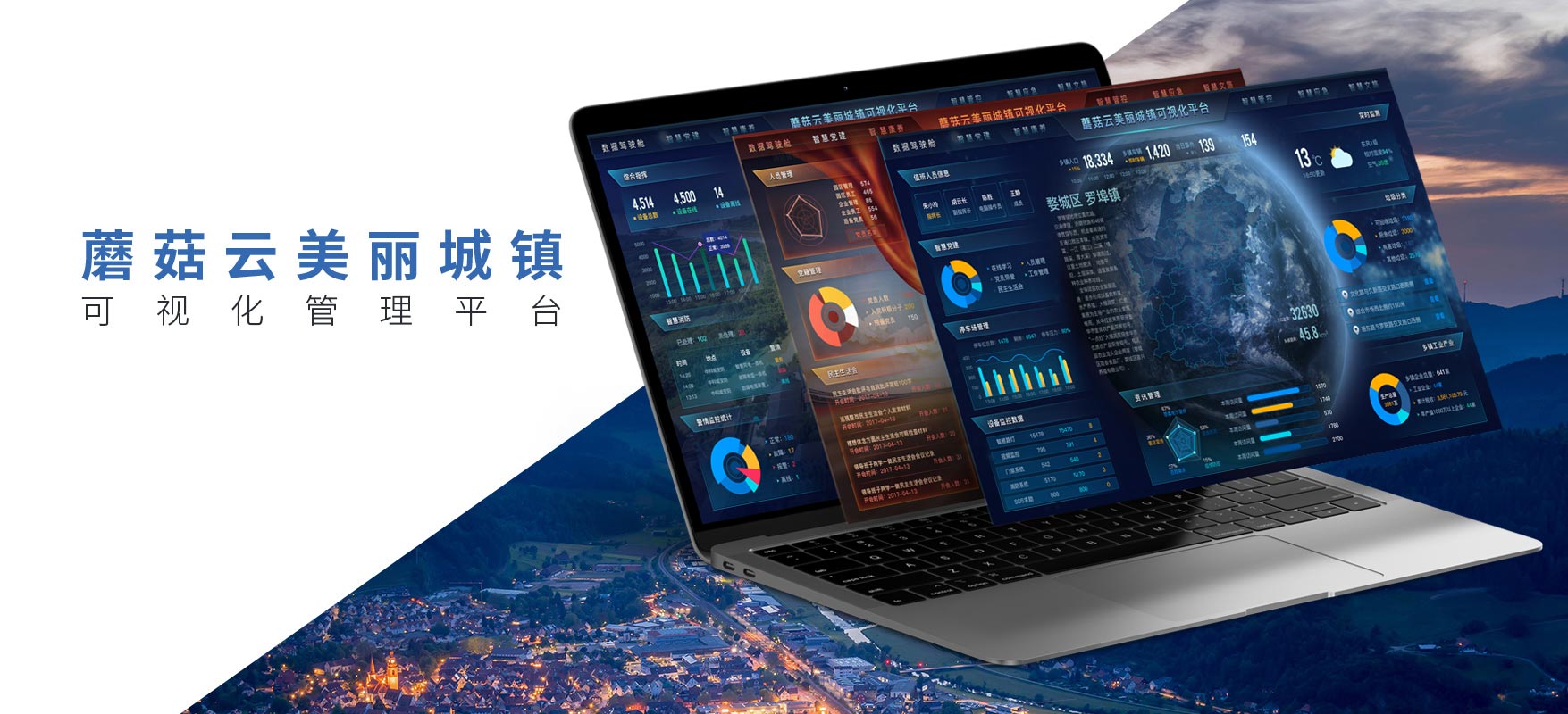 蘑菇云美丽城镇可视化管理平台 以新型城镇化为载体 将原本分散在各级部门的海量数据 通过网络可视化深度整合到统一的数据平台。采用“互联网+”解决方案, 实现基础设施、政务、民生、产业、安全、教育等与互联网的广泛在连接与充分融合, 全面提升城镇治理水平、政务服务能力、经济发展活力、 居民生活品质,为大众创业、万众创新提供有力支撑。